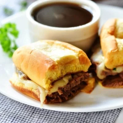 Place the first 6 ingredients in the crockpot on low for 8 hours. Shred roast and make your sandwich as desired.