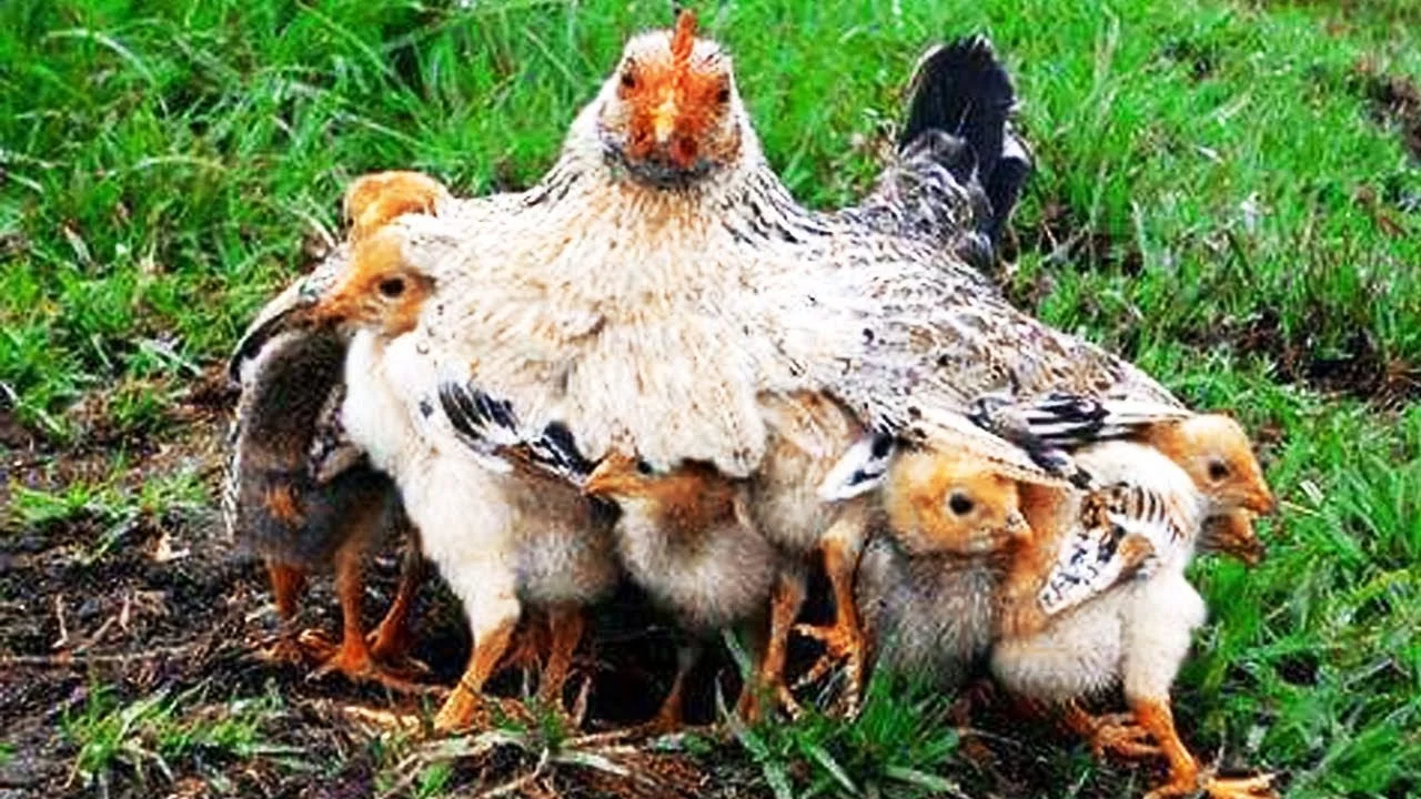 A hen gathering her chicks under her wings.