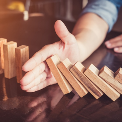 Hand stopping falling dominoes
